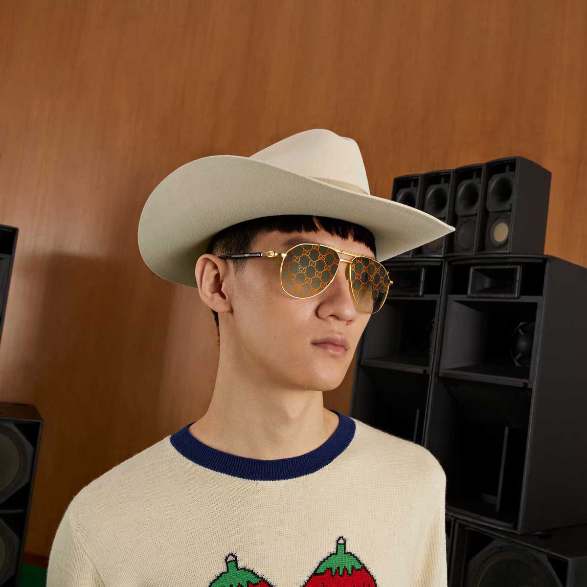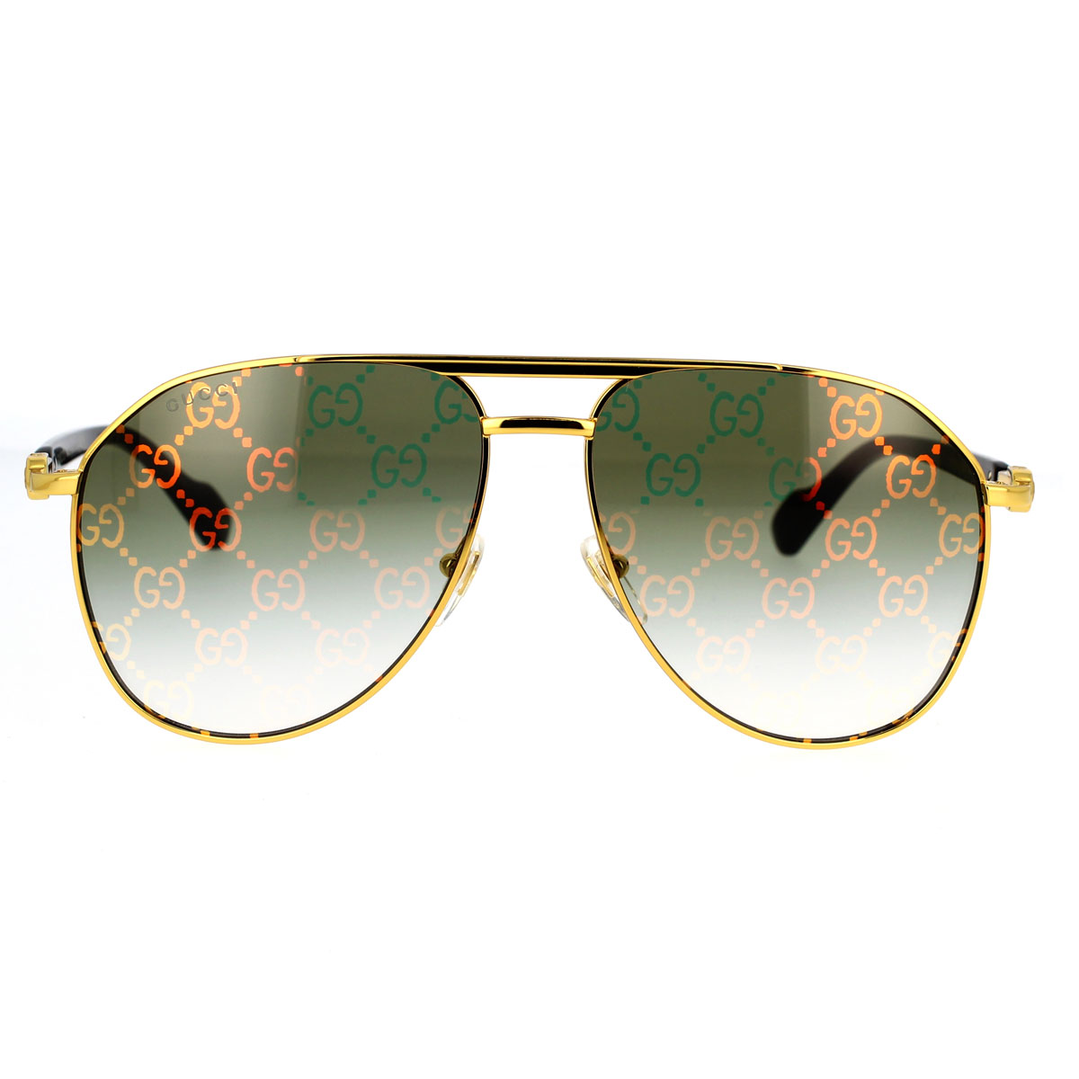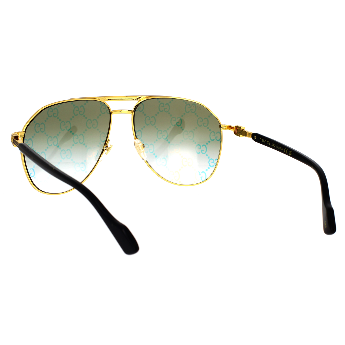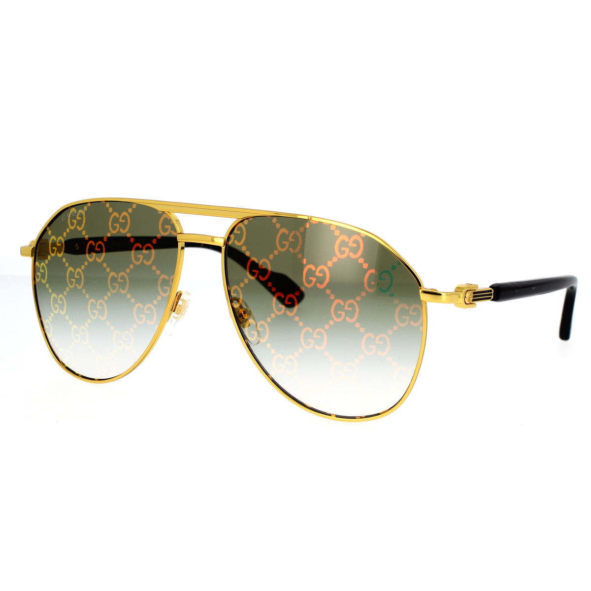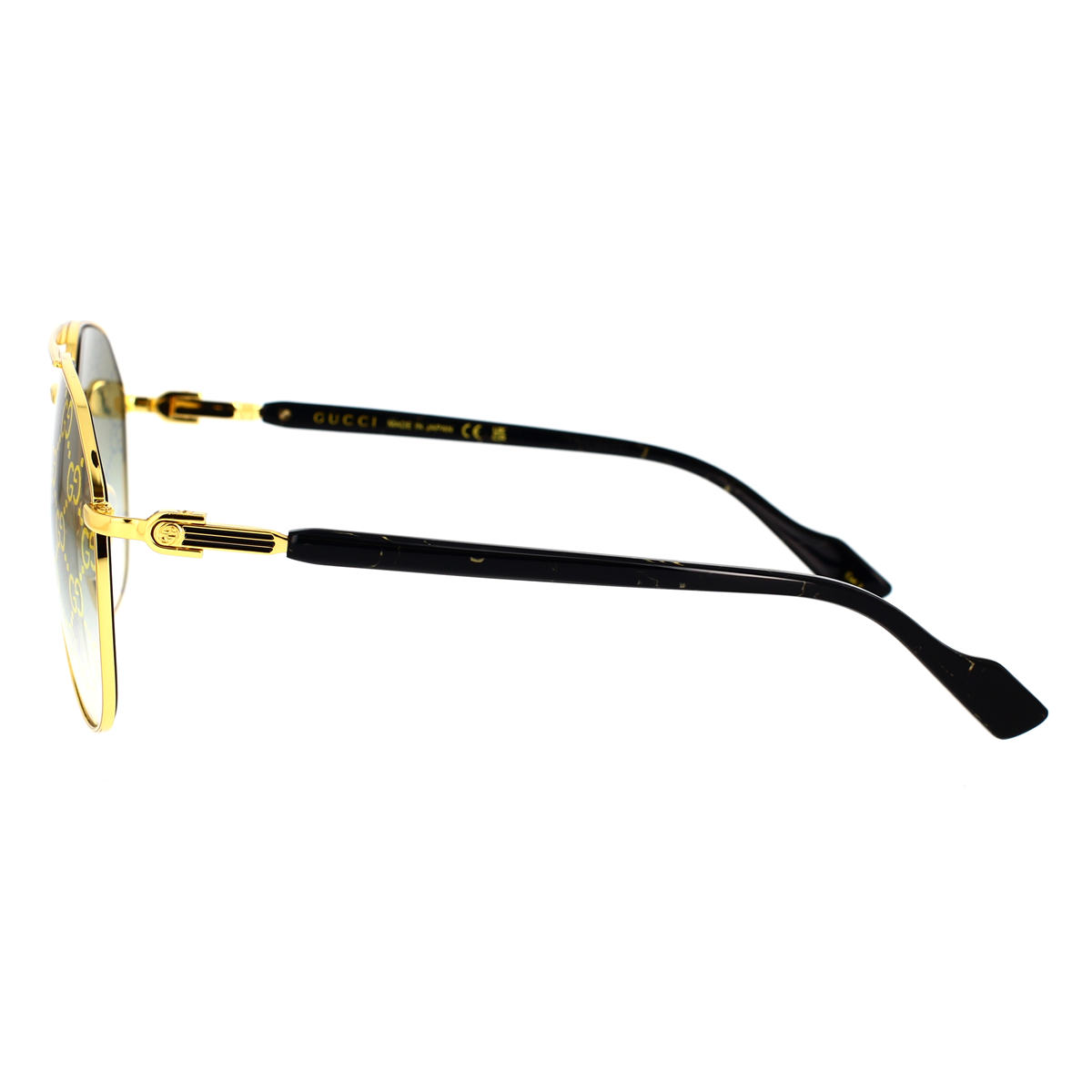 Questo modello pilot oversize presenta raffinate aste decorate con logo GG in oro, dettagli in smalto che richiamano il motivo Web e lunghi terminali in acetato. Per rendere il modello ancora più riconoscibile, una referenza presenta lenti Guccissima.