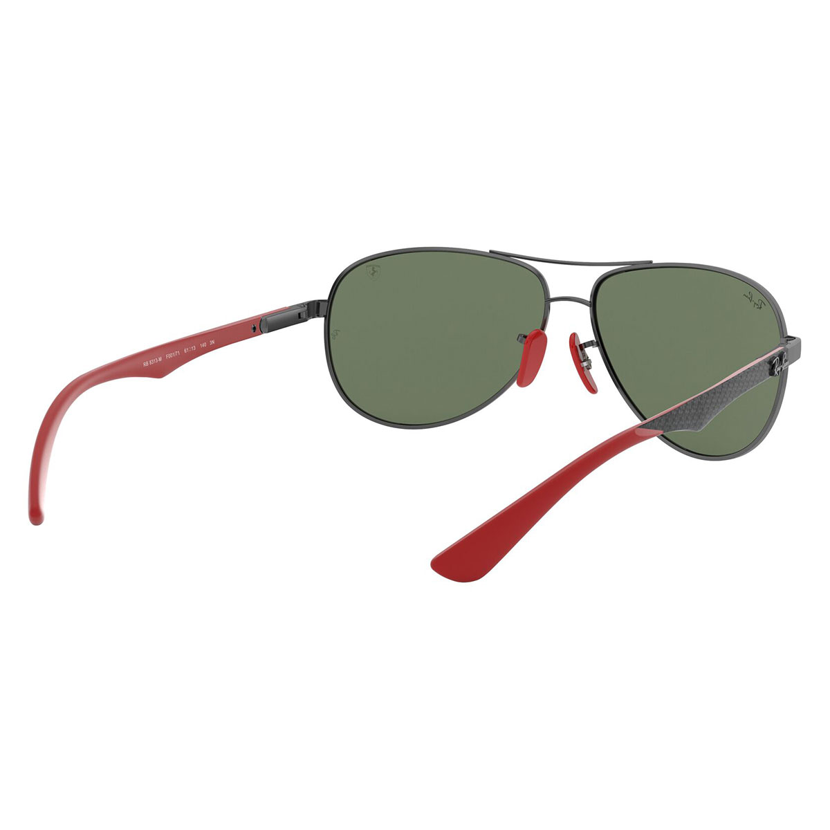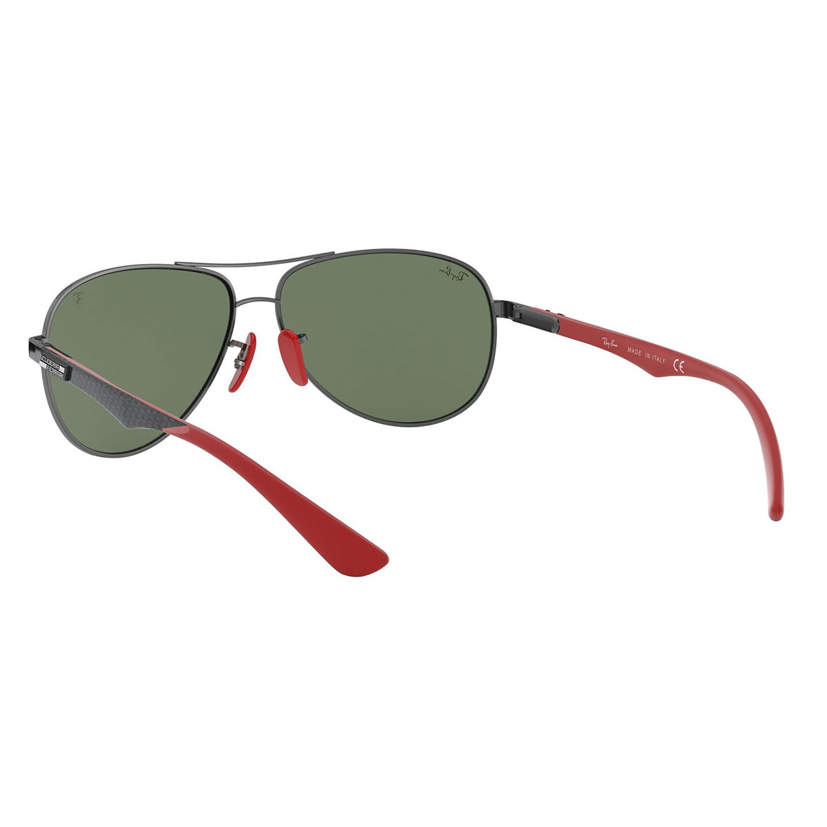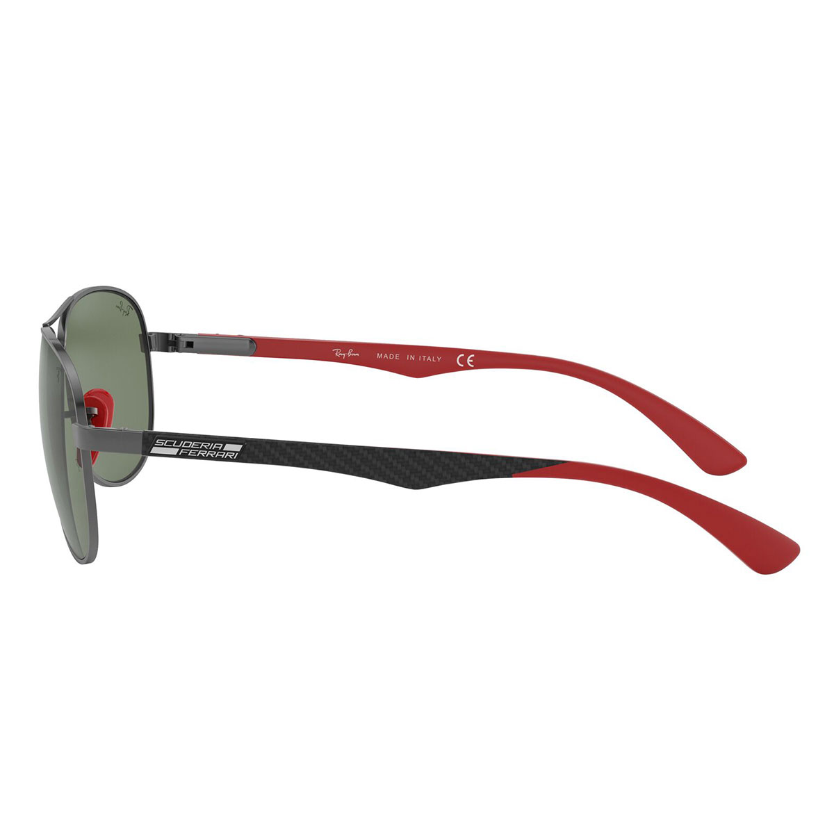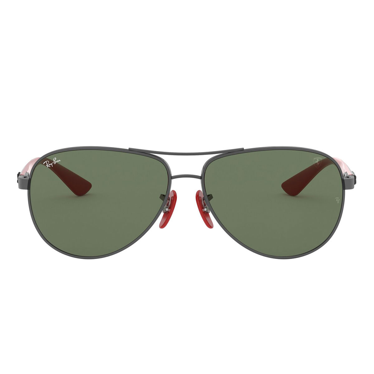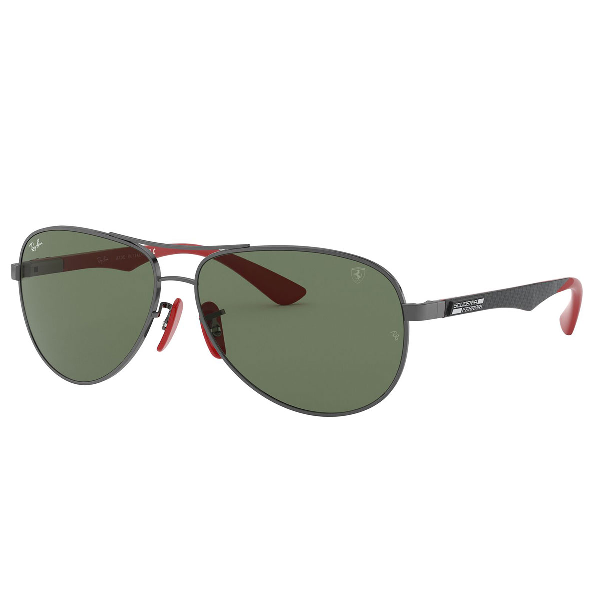 Il classico Aviator è stato alleggerito, grazie alle aste realizzate in fibra di carbonio, per regalare il massimo comfort, leggerezza e resistenza. Naselli e terminali in rosso, per richiamare i colori della Ferrari, e Scudetto della Scuderia per impreziosire le lenti.
