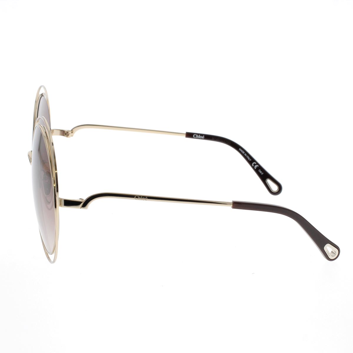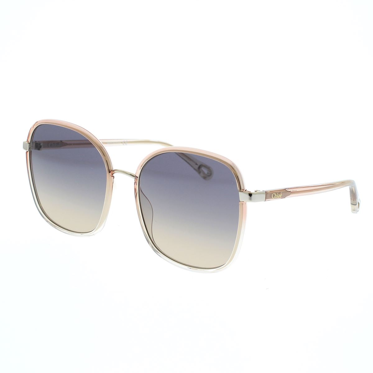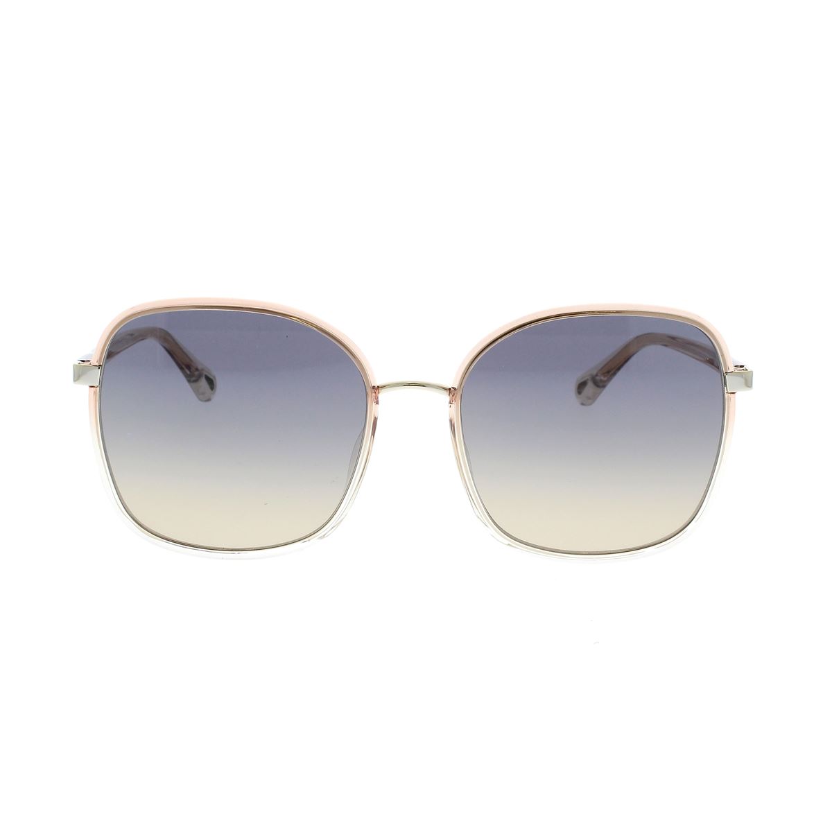 Montatura squadrata oversize in metallo d’ispirazione anni ‘70, con cerchi iniettati arcobaleno e lenti e aste sfumate. Ponte in metallo e griffe in metallo dorato che collegano i cerchi alle aste, logo stampato a caldo sull’asta sinistra. Terminali con l’iconica apertura a goccia della Maison, impreziosita dal logo inciso e pensata come elemento sia estetico che funzionale per agganciare i gioielli eyewear di Chloé.