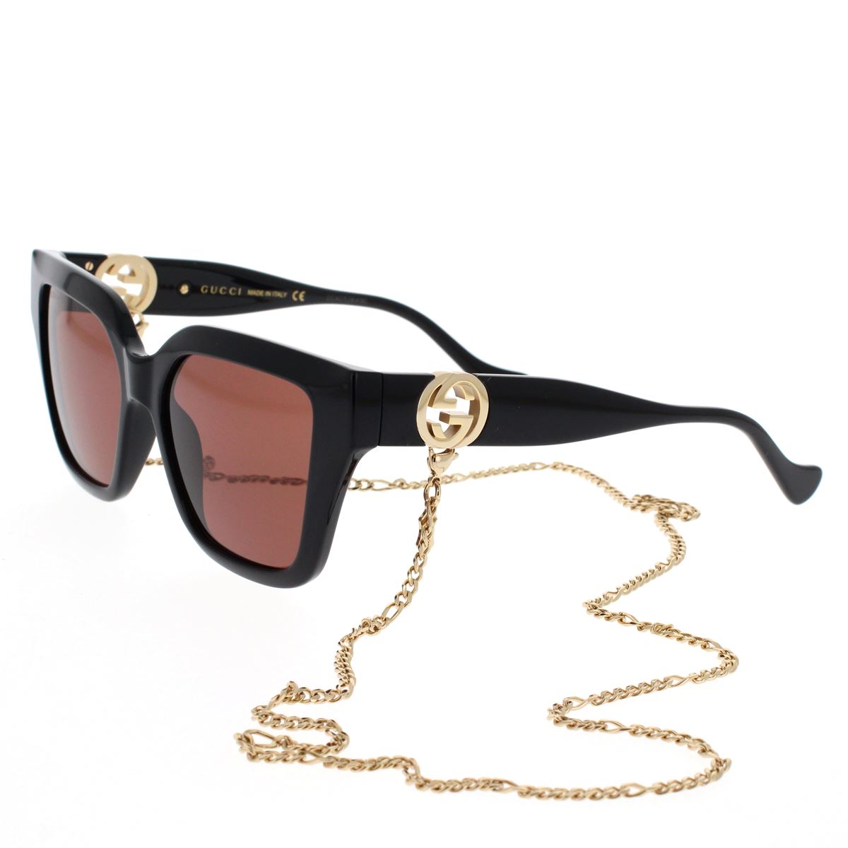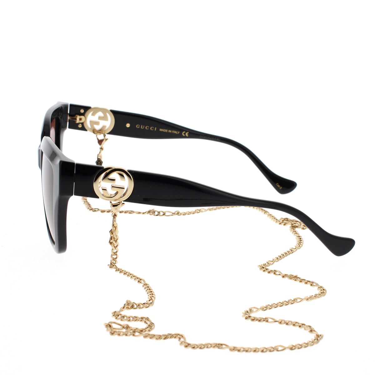 Montatura ultra femminile dalla forma cat-eye. Struttura distintiva con catena fissata dietro al logo GG come elemento integrale della montatura. Il logo GG diventa qui un dettaglio funzionale: la sua forma contraddistinta da sezioni vuote e piene funge da base, connessione e supporto del modello.