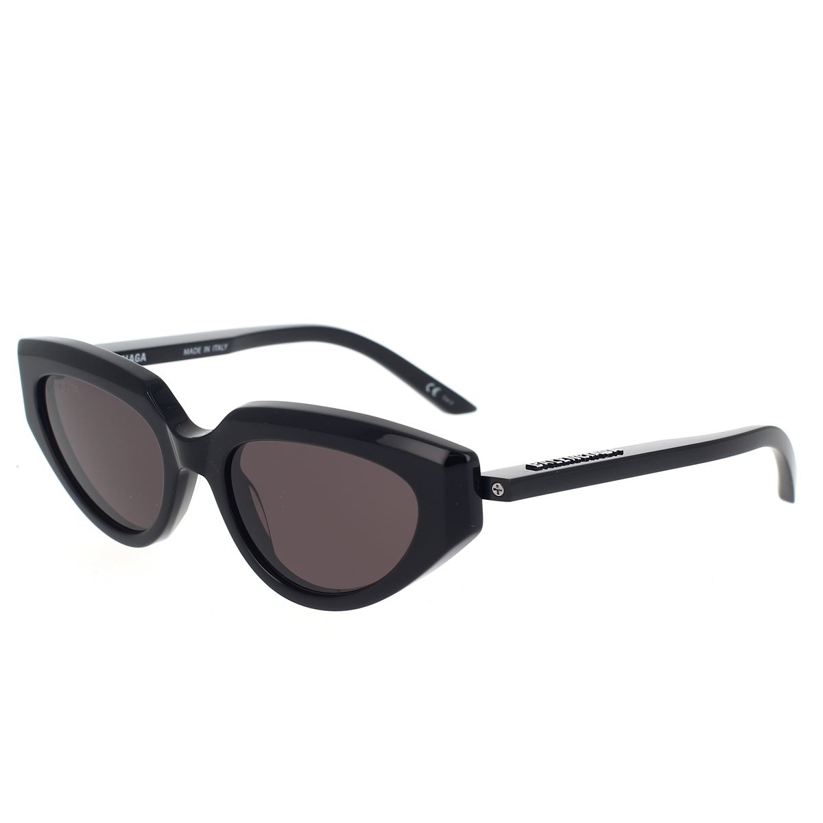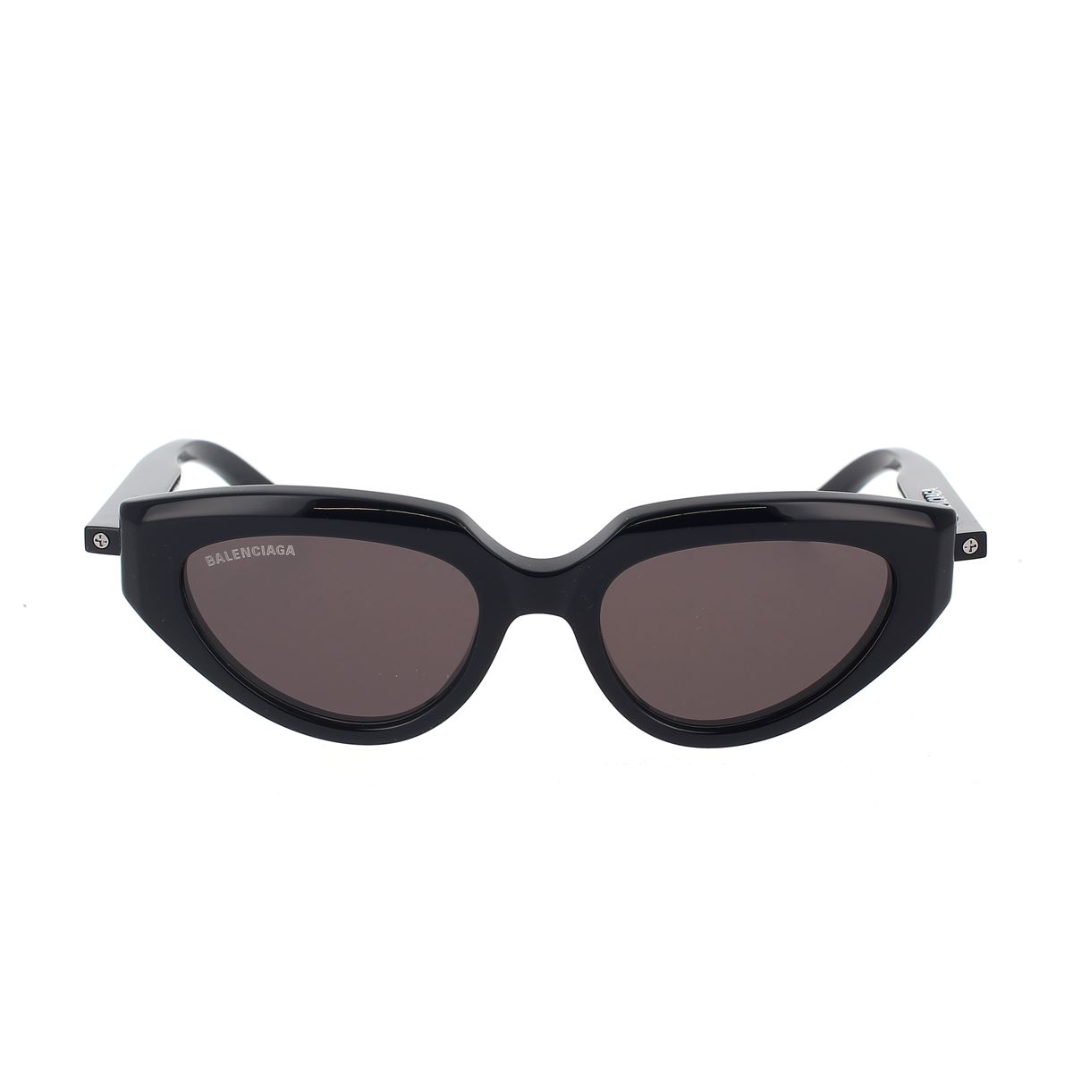 Modello Reverse Cat. Frontale in acetato con aste iniettate. Logo Balenciaga in rilievo con tampografia bianca sull’asta sinistra. Iconiche viti in metallo sul ciliare delle aste.