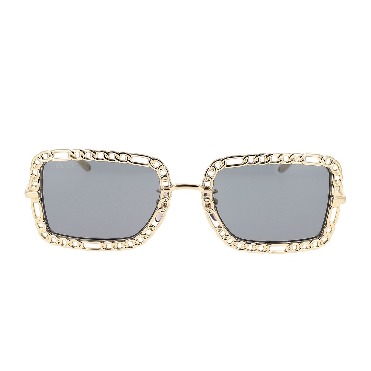 Forma squadrata stretta, oversize, in contrasto, con aste in metallo super leggero. Esclusiva costruzione a catena in metallo sul davanti arricchita da una collana pendente decorativa. La collana/catena è rimovibile per un look personalizzato. Logo Gucci lettering inciso a laser sull'asta in metallo leggero.